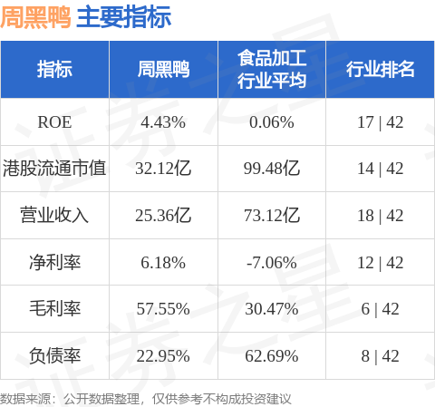 周黑鸭港股市值32.12亿港元,在食品加工行业中排名第14。主要指标见下表: