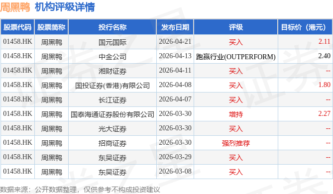 截至2026年4月23日收盘,周黑鸭(01458.HK)报收于1.48港元,下跌2.63%,成交量481.71万股,成交额707.98万港元。投行对该股的评级以买入为主,近90天内共有7家投行给出买入评级,近90天的目标均价为2.14港元。国元国际最新一份研报给予周黑鸭买入评级,目标价2.11港元。