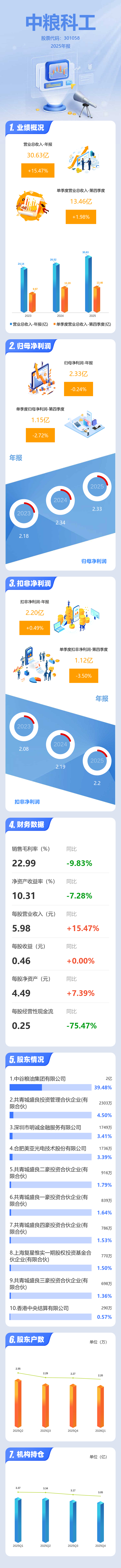 证券之星消息,中粮科工2025年年报显示,当年度公司主营收入30.63亿元,同比上升15.48%;归母净利润2.33亿元,同比下降0.25%;扣非净利润2.2亿元,同比上升0.49%;其中2025年第四季度,公司单季度主营收入13.46亿元,同比上升1.99%;单季度归母净利润1.15亿元,同比下降2.73%;单季度扣非净利润1.12亿元,同比下降3.5%;负债率51.79%,投资收益117.27万元,财务费用-1847.52万元,毛利率22.99%。