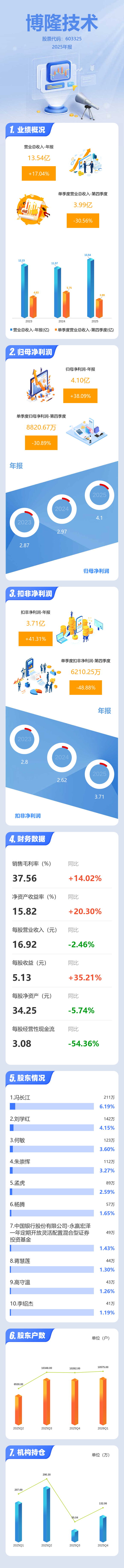 证券之星消息,博隆技术2025年年报显示,当年度公司主营收入13.54亿元,同比上升17.05%;归母净利润4.1亿元,同比上升38.09%;扣非净利润3.71亿元,同比上升41.32%;其中2025年第四季度,公司单季度主营收入3.99亿元,同比下降30.57%;单季度归母净利润8820.67万元,同比下降30.89%;单季度扣非净利润6210.25万元,同比下降48.89%;负债率51.57%,投资收益977.11万元,财务费用-4713.19万元,毛利率37.56%。