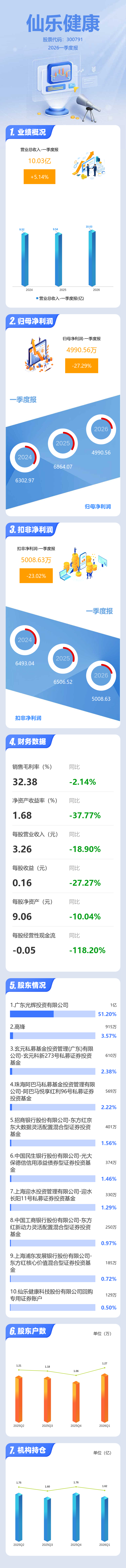 证券之星消息,仙乐健康2026年一季报显示,一季度公司主营收入10.03亿元,同比上升5.15%;归母净利润4990.56万元,同比下降27.29%;扣非净利润5008.63万元,同比下降23.02%;负债率48.12%,投资收益-215.0万元,财务费用3721.59万元,毛利率32.38%。