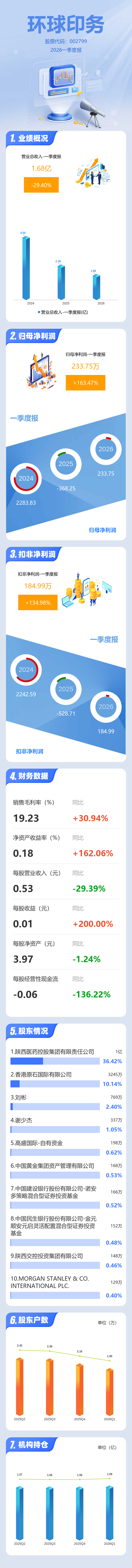 证券之星消息,环球印务2026年一季报显示,一季度公司主营收入1.68亿元,同比下降29.41%;归母净利润233.75万元,同比上升163.48%;扣非净利润184.99万元,同比上升134.99%;负债率26.75%,投资收益147.25万元,财务费用57.11万元,毛利率19.23%。