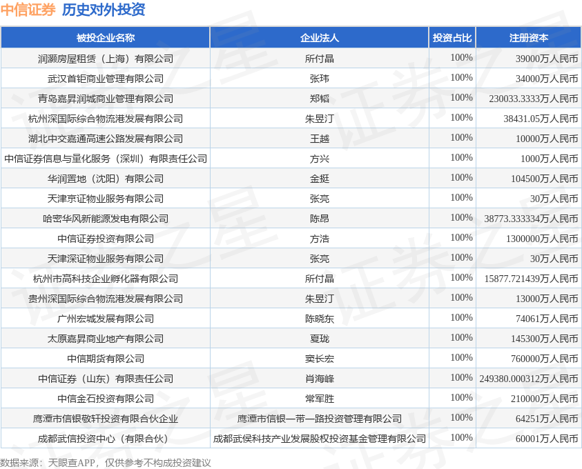 通过天眼查大数据分析,中信证券股份有限公司共对外投资了242家企业,参与招投标项目5561次;财产线索方面有商标信息133条,专利信息79条,著作权信息5863条;此外企业还拥有行政许可58个。据2025年报数据,中信证券商誉84.36亿元,同比减0.14%。长期股权投资99.53亿元,同比增3.59%。