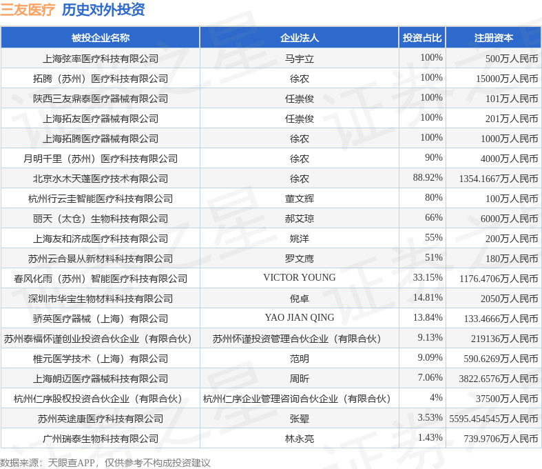 证券之星消息,根据天眼查APP显示,三友医疗(688085.SH)新增一起对外投资事件,被投资公司为杭州行云圭智能医疗科技有限公司,法定代表人董文辉,投资占比为80%。该公司从事科技推广和应用服务业,注册资本为100万人民币。目前,三友医疗共存在对外投资20项,详见下表: