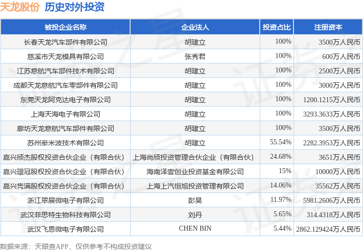 证券之星消息,根据天眼查APP显示,天龙股份(603266.SH)新增一起对外投资事件,被投资公司为苏州豪米波技术有限公司,法定代表人胡建立,投资占比为55.54%。该公司从事研究和试验发展,注册资本为2282.3953万人民币。目前,天龙股份共存在对外投资14项,详见下表: