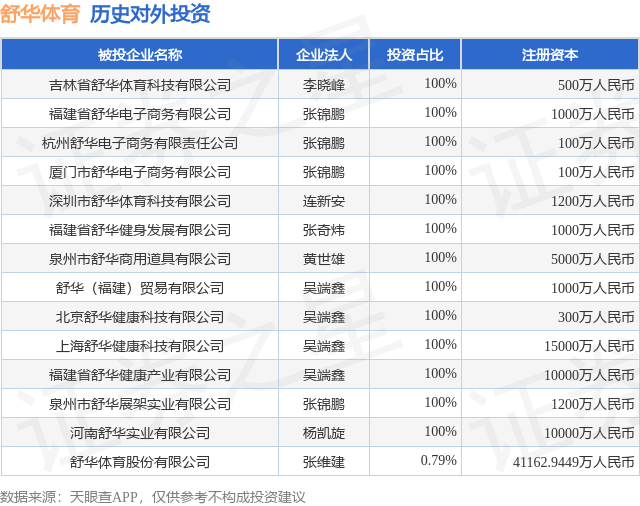 通过天眼查大数据分析,舒华体育股份有限公司共对外投资了19家企业,参与招投标项目4510次;财产线索方面有商标信息267条,专利信息613条,著作权信息50条;此外企业还拥有行政许可7个。
