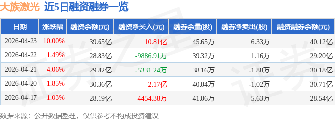 大族激光融资融券信息显示,融资方面,当日融资买入16.93亿元,融资偿还6.11亿元,融资净买入10.81亿元,净买入额两市排名第1。融券方面,融券卖出7.37万股,融券偿还1.04万股,融券余量45.65万股,融券余额4729.34万元。融资融券余额40.12亿元。