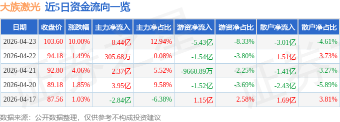 证券之星消息,截至2026年4月23日收盘,大族激光(002008)报收于103.6元,上涨10.0%,涨停,换手率6.81%,成交量65.12万手,成交额65.23亿元。