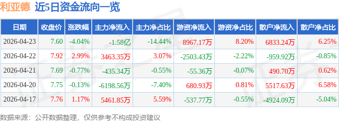 证券之星消息,截至2026年4月23日收盘,利亚德(300296)报收于7.6元,下跌4.04%,换手率6.25%,成交量142.17万手,成交额10.94亿元。