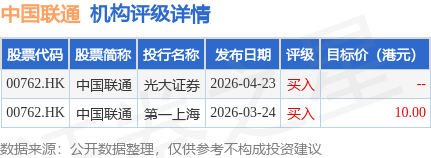 投行对该股的评级以买入为主,近90天内共有2家投行给出买入评级,近90天的目标均价为10港元。光大证券最新一份研报给予中国联通买入评级。