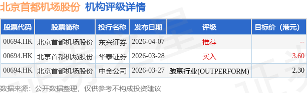 投行对该股的评级以跑赢行业(OUTPERFORM)为主,近90天内共有1家投行给出跑赢行业(OUTPERFORM)评级,近90天的目标均价为2.95港元。东兴证券最新一份研报给予北京首都机场股份推荐评级。