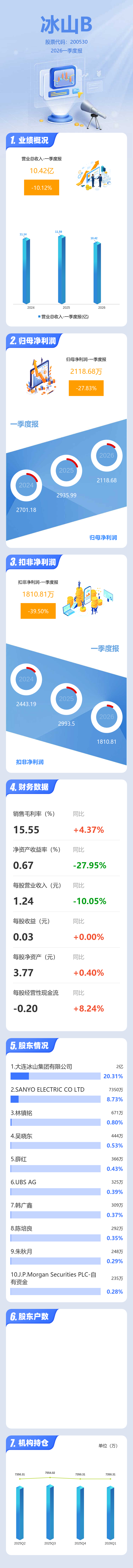 证券之星消息,冰山B2026年一季报显示,一季度公司主营收入10.42亿元,同比下降10.13%;归母净利润2118.68万元,同比下降27.84%;扣非净利润1810.81万元,同比下降39.51%;负债率55.94%,投资收益402.68万元,财务费用721.86万元,毛利率15.55%。