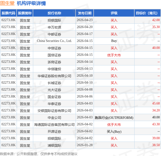 投行对该股的评级以买入为主,近90天内共有14家投行给出买入评级,近90天的目标均价为39.78港元。招银国际最新一份研报给予固生堂买入评级,目标价42港元。