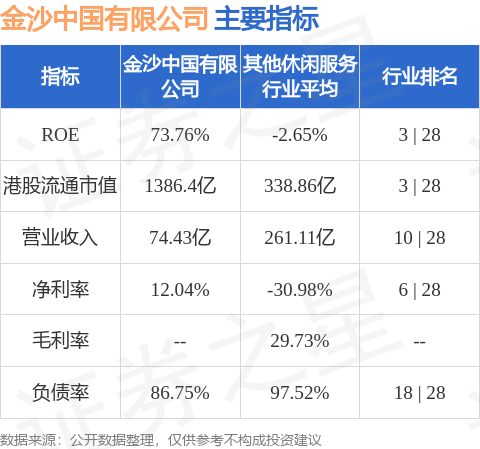金沙中国有限公司港股市值1386.4亿港元,在其他休闲服务行业中排名第3。主要指标见下表: