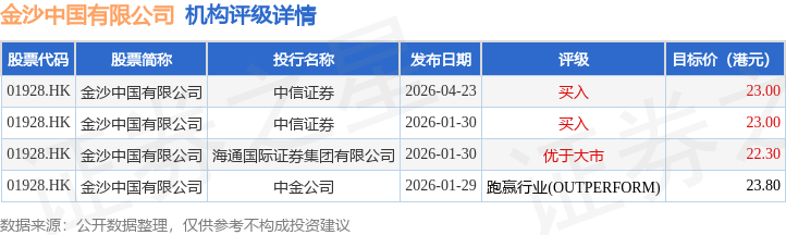 投行对该股的评级以买入为主,近90天内共有2家投行给出买入评级,近90天的目标均价为23.02港元。中信证券最新一份研报给予金沙中国有限公司买入评级,目标价23港元。