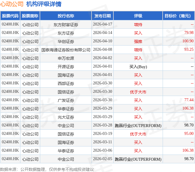 投行对该股的评级以买入为主,近90天内共有9家投行给出买入评级,近90天的目标均价为95.19港元。东方财富证券最新一份研报给予心动公司增持评级。