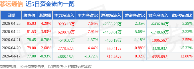 4月23日的资金流向数据方面,主力资金净流入9293.13万元,占总成交额7.64%,游资资金净流出2856.29万元,占总成交额2.35%,散户资金净流出6436.84万元,占总成交额5.29%。