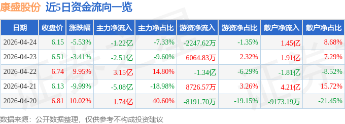 证券之星消息,截至2026年4月24日收盘,康盛股份(002418)报收于6.15元,下跌5.53%,换手率23.63%,成交量268.54万手,成交额16.68亿元。