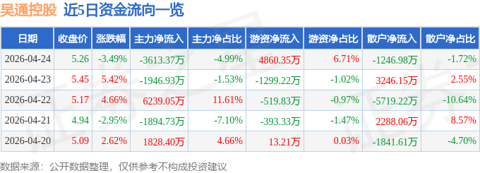 证券之星消息,截至2026年4月24日收盘,吴通控股(300292)报收于5.26元,下跌3.49%,换手率12.25%,成交量136.67万手,成交额7.25亿元。