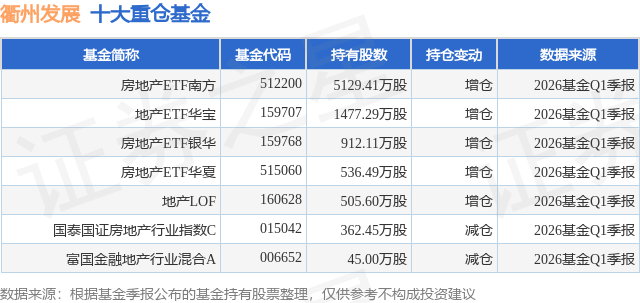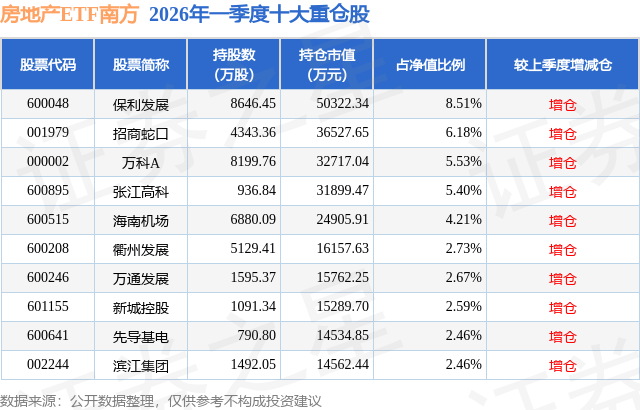 根据2026基金Q1季报公募基金重仓股数据,重仓该股的公募基金共7家,其中持有数量最多的公募基金为南方基金的房地产ETF南方。房地产ETF南方目前规模为59.12亿元,最新净值1.3898(4月23日),较上一交易日下跌0.69%,近一年下跌2.3%。该公募基金现任基金经理为罗文杰。罗文杰在任的基金产品包括:500ETF联接LOF,管理时间为2013年4月22日至今,期间收益率为178.62%;中证500ETF南方,管理时间为2013年4月22日至今,期间收益率为189.24%;沪深300ETF南方,管理时间为2013年5月17日至今,期间收益率为162.6%;南方沪深300ETF联接A,管理时间为2013年5月17日至今,期间收益率为146.87%。