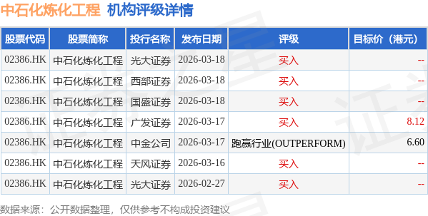 截至2026年4月24日收盘,中石化炼化工程(02386.HK)报收于6.34港元,下跌1.25%,成交量355.95万股,成交额2262.13万港元。投行对该股的评级以买入为主,近90天内共有6家投行给出买入评级,近90天的目标均价为7.36港元。光大证券最新一份研报给予中石化炼化工程买入评级。
