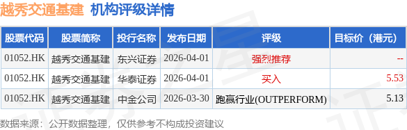 截至2026年4月24日收盘,越秀交通基建(01052.HK)报收于4.08港元,下跌0.24%,成交量113.42万股,成交额463.47万港元。投行对该股的评级以跑赢行业(OUTPERFORM)为主,近90天内共有1家投行给出跑赢行业(OUTPERFORM)评级,近90天的目标均价为5.33港元。东兴证券最新一份研报给予越秀交通基建强烈推荐评级。