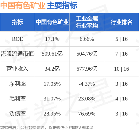 中国有色矿业港股市值509.61亿港元,在工业金属行业中排名第7。主要指标见下表: