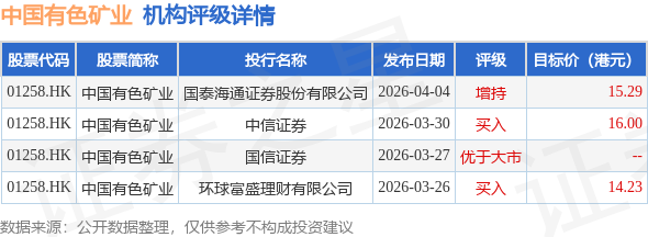 截至2026年4月24日收盘,中国有色矿业(01258.HK)报收于13.18港元,上涨0.92%,成交量1072.87万股,成交额1.4亿港元。投行对该股的评级以买入为主,近90天内共有2家投行给出买入评级,近90天的目标均价为15.17港元。国泰海通证券股份有限公司最新一份研报给予中国有色矿业增持评级,目标价15.29港元。