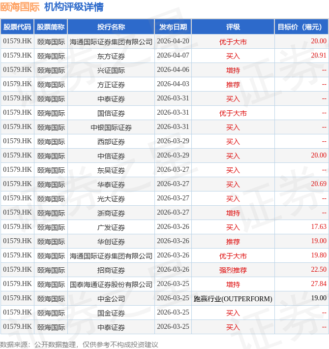 截至2026年4月24日收盘,颐海国际(01579.HK)报收于15.51港元,下跌1.15%,成交量299.91万股,成交额4662.74万港元。投行对该股的评级以买入为主,近90天内共有11家投行给出买入评级,近90天的目标均价为20.74港元。海通国际证券集团有限公司最新一份研报给予颐海国际优于大市评级,目标价20港元。