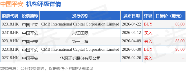 截至2026年4月24日收盘,中国平安(02318.HK)报收于60.95港元,上涨0.41%,成交量2230.33万股,成交额13.54亿港元。投行对该股的评级以买入为主,近90天内共有3家投行给出买入评级,近90天的目标均价为88港元。CMB International Capital Corporation Limited最新一份研报给予中国平安BUY评级,目标价86港元。