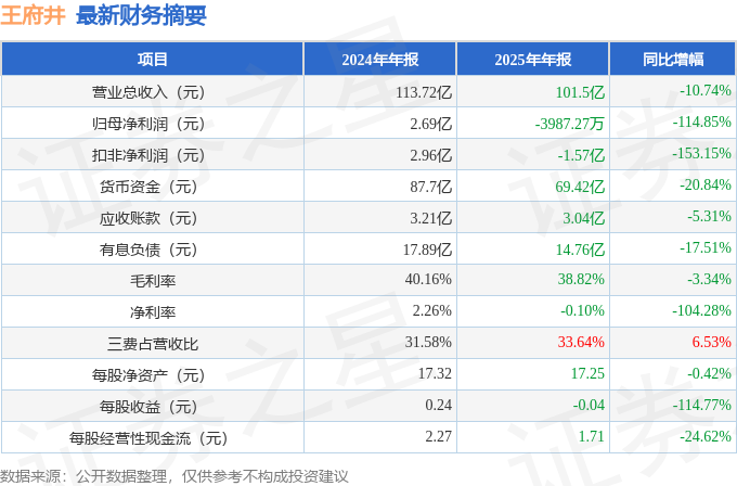据证券之星公开数据整理,近期王府井(600859)发布2025年年报。根据财报显示,王府井净利润同比下降114.85%。截至本报告期末,公司营业总收入101.5亿元,同比下降10.74%,归母净利润-3987.27万元,同比下降114.85%。按单季度数据看,第四季度营业总收入24.41亿元,同比下降15.01%,第四季度归母净利润-1.64亿元,同比下降3.38%。