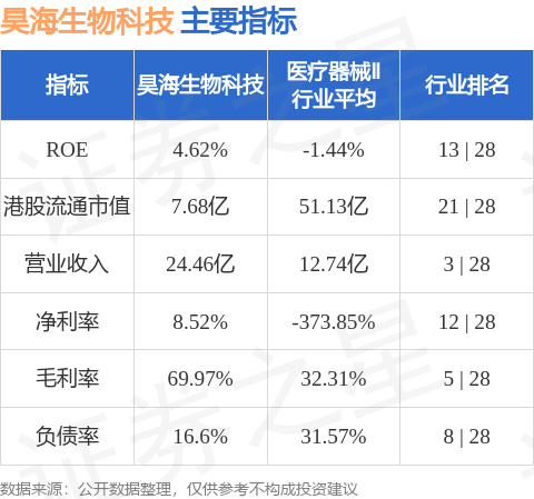 昊海生物科技港股市值7.68亿港元,在医疗器械Ⅱ行业中排名第21。主要指标见下表: