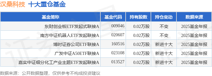 持有汉桑科技最多的基金为东财创业板ETF发起式联接A,目前规模为1.43亿元,最新净值2.2196(4月23日),较上一交易日下跌0.82%,近一年上涨44.9%。该基金现任基金经理为赵肖萌。