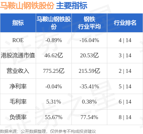 马鞍山钢铁股份港股市值46.62亿港元,在钢铁行业中排名第3。主要指标见下表: