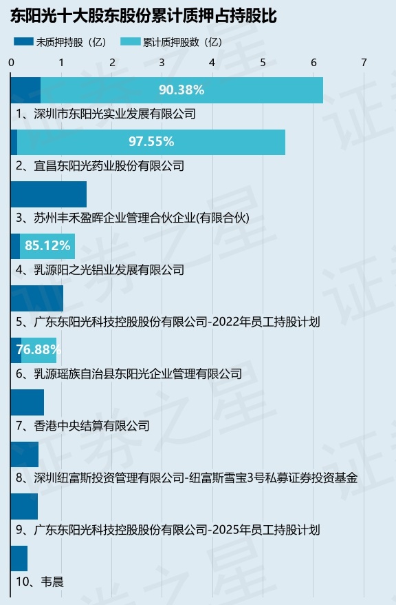 截止本公告日,股东深圳市东阳光实业发展有限公司已累计质押股份5.6亿股,占其持股总数的90.38%,股东宜昌东阳光药业股份有限公司已累计质押股份5.32亿股,占其持股总数的97.55%,股东乳源阳之光铝业发展有限公司已累计质押股份1.09亿股,占其持股总数的85.12%,股东乳源瑶族自治县东阳光企业管理有限公司已累计质押股份7000.0万股,占其持股总数的76.88%。本次质押后东阳光十大股东的累计质押股份占持股比例(占持股比例的计算以公司最新一期财务报表公布的十大股东的持股总数为基准)见下图: