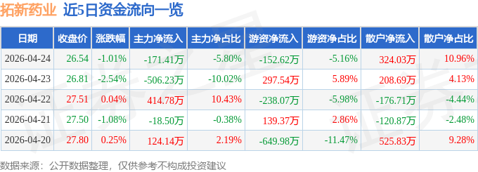 证券之星消息,截至2026年4月24日收盘,拓新药业(301089)报收于26.54元,下跌1.01%,换手率1.23%,成交量1.11万手,成交额2956.48万元。