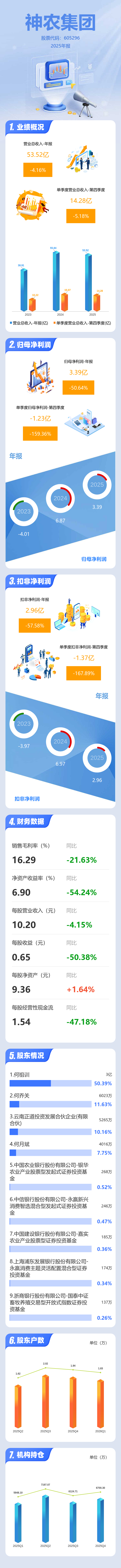 证券之星消息,神农集团2025年年报显示,当年度公司主营收入53.52亿元,同比下降4.16%;归母净利润3.39亿元,同比下降50.65%;扣非净利润2.96亿元,同比下降57.58%;其中2025年第四季度,公司单季度主营收入14.28亿元,同比下降5.18%;单季度归母净利润-1.23亿元,同比下降159.36%;单季度扣非净利润-1.37亿元,同比下降167.9%;负债率29.53%,投资收益1196.76万元,财务费用2188.22万元,毛利率16.29%。