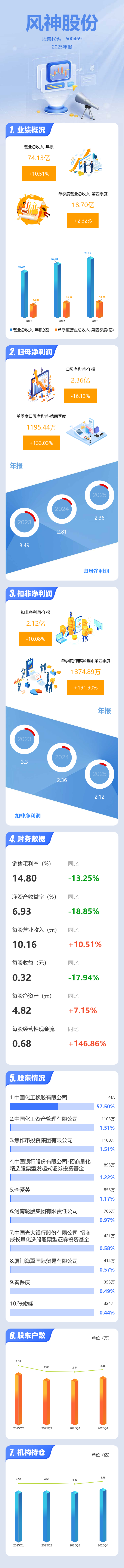 证券之星消息,风神股份2025年年报显示,当年度公司主营收入74.13亿元,同比上升10.51%;归母净利润2.36亿元,同比下降16.14%;扣非净利润2.12亿元,同比下降10.08%;其中2025年第四季度,公司单季度主营收入18.7亿元,同比上升2.32%;单季度归母净利润1195.44万元,同比上升133.04%;单季度扣非净利润1374.89万元,同比上升191.9%;负债率55.84%,投资收益-9068.68万元,财务费用624.61万元,毛利率14.8%。