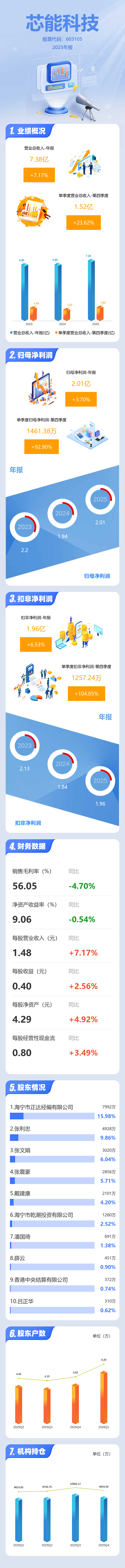 证券之星消息,芯能科技2025年年报显示,当年度公司主营收入7.38亿元,同比上升7.17%;归母净利润2.01亿元,同比上升3.7%;扣非净利润1.96亿元,同比上升6.53%;其中2025年第四季度,公司单季度主营收入1.52亿元,同比上升23.63%;单季度归母净利润1461.38万元,同比上升92.9%;单季度扣非净利润1257.24万元,同比上升104.06%;负债率49.67%,投资收益336.62万元,财务费用9007.7万元,毛利率56.05%。