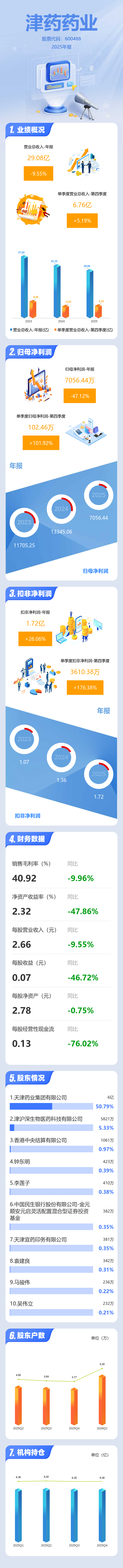证券之星消息,津药药业2025年年报显示,当年度公司主营收入29.08亿元,同比下降9.56%;归母净利润7056.44万元,同比下降47.12%;扣非净利润1.72亿元,同比上升26.07%;其中2025年第四季度,公司单季度主营收入6.76亿元,同比上升5.2%;单季度归母净利润102.46万元,同比上升101.92%;单季度扣非净利润3610.38万元,同比上升176.39%;负债率32.38%,投资收益-79.87万元,财务费用1508.89万元,毛利率40.92%。