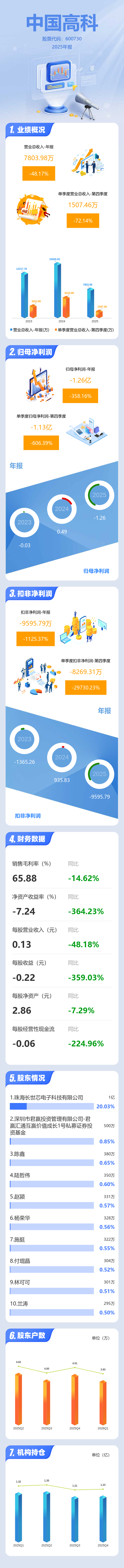 证券之星消息,中国高科2025年年报显示,当年度公司主营收入7803.98万元,同比下降48.18%;归母净利润-1.26亿元,同比下降358.17%;扣非净利润-9595.79万元,同比下降1125.37%;其中2025年第四季度,公司单季度主营收入1507.46万元,同比下降72.14%;单季度归母净利润-1.13亿元,同比下降606.39%;单季度扣非净利润-8269.31万元,同比下降29730.23%;负债率11.62%,投资收益-170.87万元,财务费用-1570.45万元,毛利率65.88%。