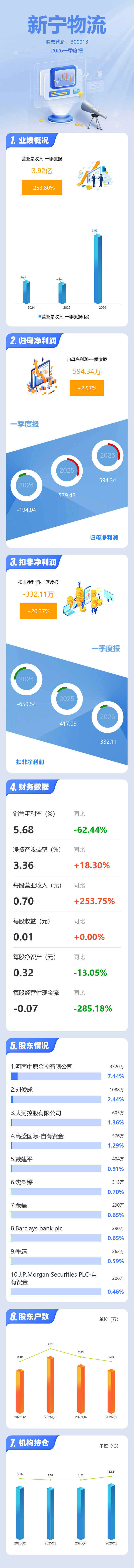 证券之星消息,新宁物流2026年一季报显示,一季度公司主营收入3.92亿元,同比上升253.81%;归母净利润594.34万元,同比上升2.58%;扣非净利润-332.11万元,同比上升20.38%;负债率76.08%,投资收益385.29万元,财务费用403.95万元,毛利率5.68%。