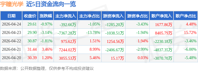 证券之星消息,截至2026年4月24日收盘,宇瞳光学(300790)报收于29.61元,下跌0.97%,换手率3.89%,成交量12.63万手,成交额3.75亿元。