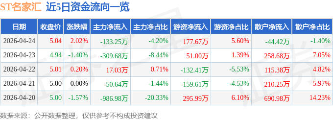 证券之星消息,截至2026年4月24日收盘,ST名家汇(300506)报收于5.04元,上涨2.02%,换手率0.87%,成交量6.4万手,成交额3173.22万元。