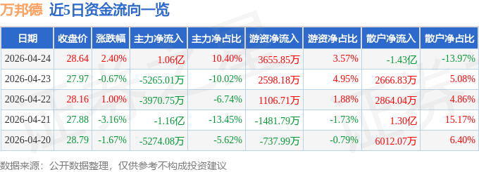 证券之星消息,截至2026年4月24日收盘,万邦德(002082)报收于28.64元,上涨2.4%,换手率6.44%,成交量35.64万手,成交额10.24亿元。
