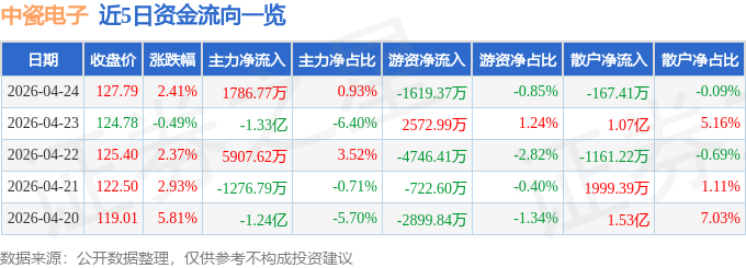 证券之星消息,截至2026年4月24日收盘,中瓷电子(003031)报收于127.79元,上涨2.41%,换手率4.4%,成交量14.98万手,成交额19.14亿元。