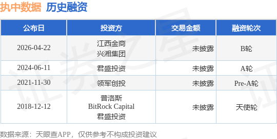 证券之星消息,根据天眼查APP于4月22日公布的信息整理,执中数据科技(苏州)有限责任公司B轮融资,融资额未披露,参与投资的机构包括江西金商,兴湘集团。