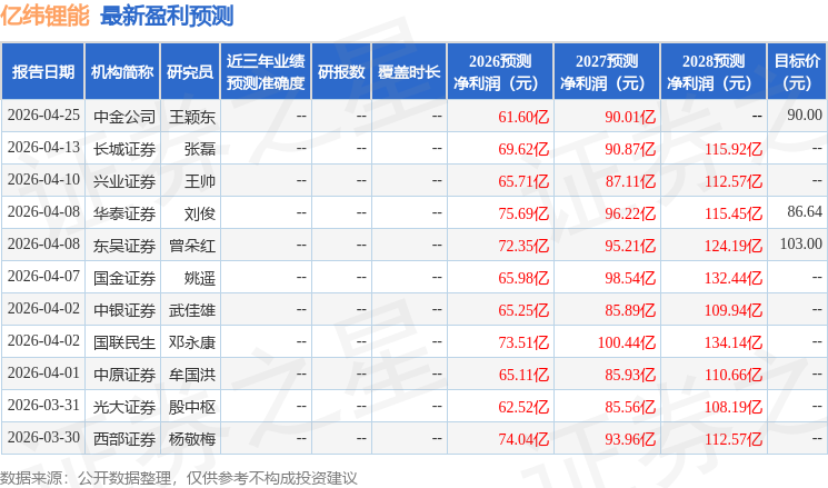 东吴证券股份有限公司曾朵红,阮巧燕,岳斯瑶,朱家佟近期对亿纬锂能进行研究并发布了研究报告《2026年一季报点评:动储经营持续高增,盈利逐季提升可期》,上调亿纬锂能目标价至111.0元,给予买入评级。
