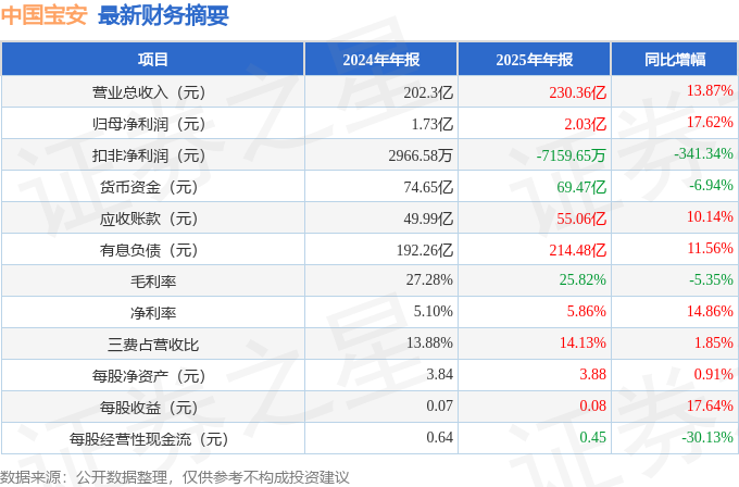 据证券之星公开数据整理,近期中国宝安(000009)发布2025年年报。截至本报告期末,公司营业总收入230.36亿元,同比上升13.87%,归母净利润2.03亿元,同比上升17.62%。按单季度数据看,第四季度营业总收入62.24亿元,同比上升11.26%,第四季度归母净利润-8019.14万元,同比上升62.31%。本报告期中国宝安公司应收账款体量较大,当期应收账款占最新年报归母净利润比达2711.64%。
