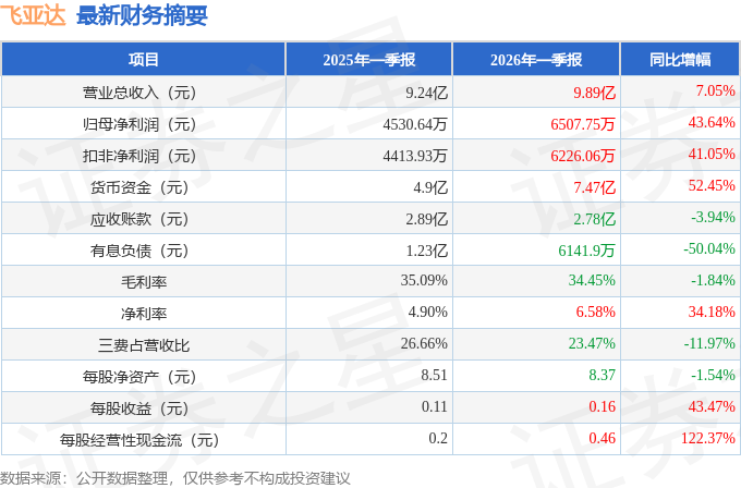据证券之星公开数据整理,近期飞亚达(000026)发布2026年一季报。截至本报告期末,公司营业总收入9.89亿元,同比上升7.05%,归母净利润6507.75万元,同比上升43.64%。按单季度数据看,第一季度营业总收入9.89亿元,同比上升7.05%,第一季度归母净利润6507.75万元,同比上升43.64%。本报告期飞亚达公司应收账款体量较大,当期应收账款占最新年报归母净利润比达318.33%。
